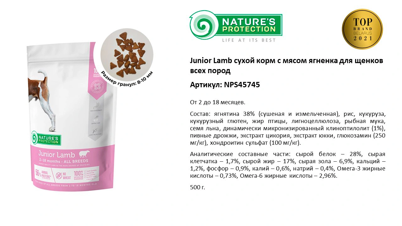 Nature’s Protection Junior Lamb — сухой корм для молодых собак (от 2 до 18 месяцев) всех пород с мясом ягненка При производстве корма не используются мясные субпродукты, только мясо Содержание ингредиентов животного происхождения — 54.2%