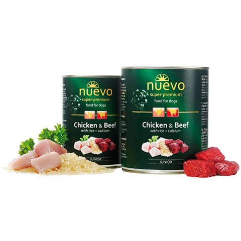 Nuevo Junior 400 гр с курицей, говядиной, рисом и кальцием — влажный корм NUEVO JUNIOR ориентирован на обеспечение необходимыми веществами, поддерживающими растущий организм щенка. Высокое содержание свежей курицы и говядины обеспечивает мясные белки высокой биологической ценности.