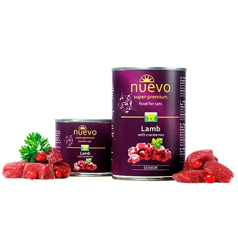 Nuevo Senior консервы для кошек с ягненком и клюквой предназначены для котов старшего возраста, с аллергией на куриное мясо.