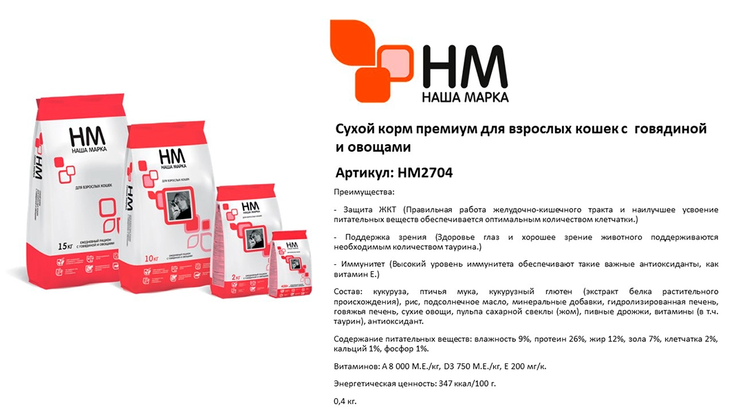 Корм «НМ» для взрослых кошек — это полноценный сухой корм для взрослых кошек с говядиной и овощами.