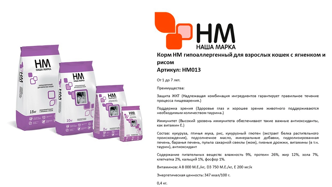 Корм «НМ» гипоаллергенный для взрослых кошек — это сухой корм для взрослых кошек с ягненком и рисом.
