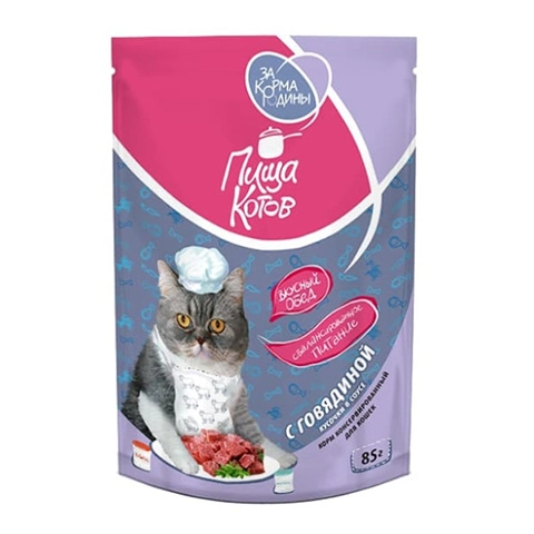 ЗА КОРМА РОДИНЫ «Пища котов с говядиной, кусочки в соусе» — влажный корм для взрослых кошек.